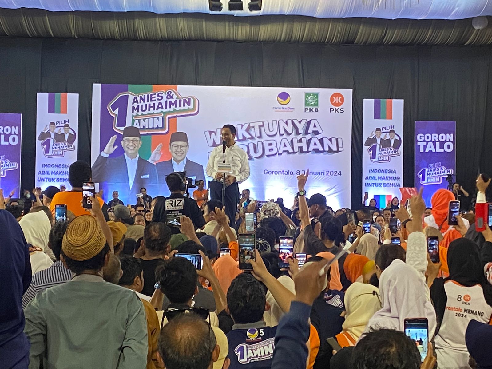 KOMPARASI.ID – Calon Presiden RI, Anies Baswedan, disambut meriah Ratusan simpatisan dari berbagai lapisan masyarakat Gorontalo di Grand Sumber Ria Ballroom. pada Senin (8/1/2024), ,