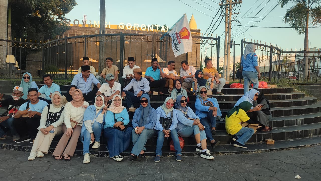Para kader Gerindra SE Provinsi Gorontalo berkumpul dengan antusias untuk menyiapkan dan mendistribusikan takjil kepada warga yang melintas di Simpang Lima Telaga.