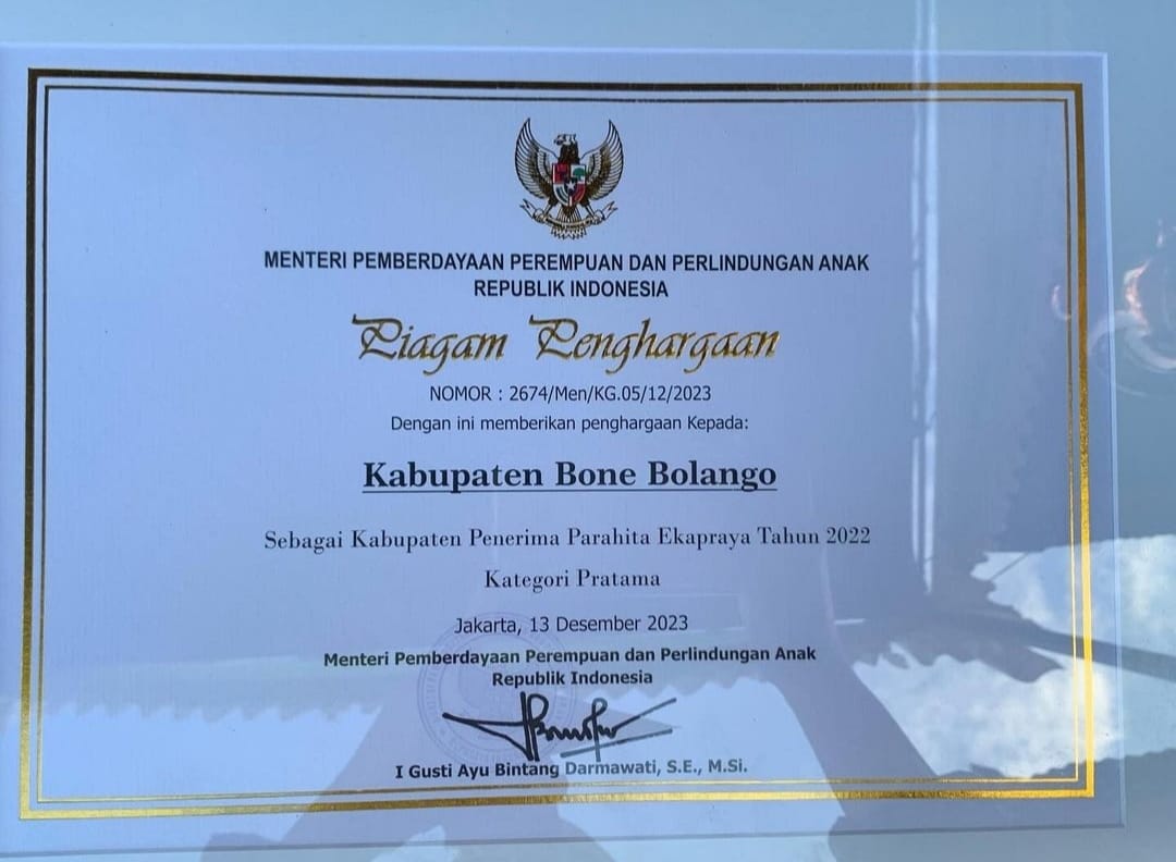 KOMPARASI.ID, Bonebolango – Pemerintah Kabupaten Bonebolango kembali menorehkan prestasi gemilang dengan menerima penghargaan Anugerah Parahita Ekapraya dari Kementerian Pemberdayaan Perempuan dan Perlindungan Anak.