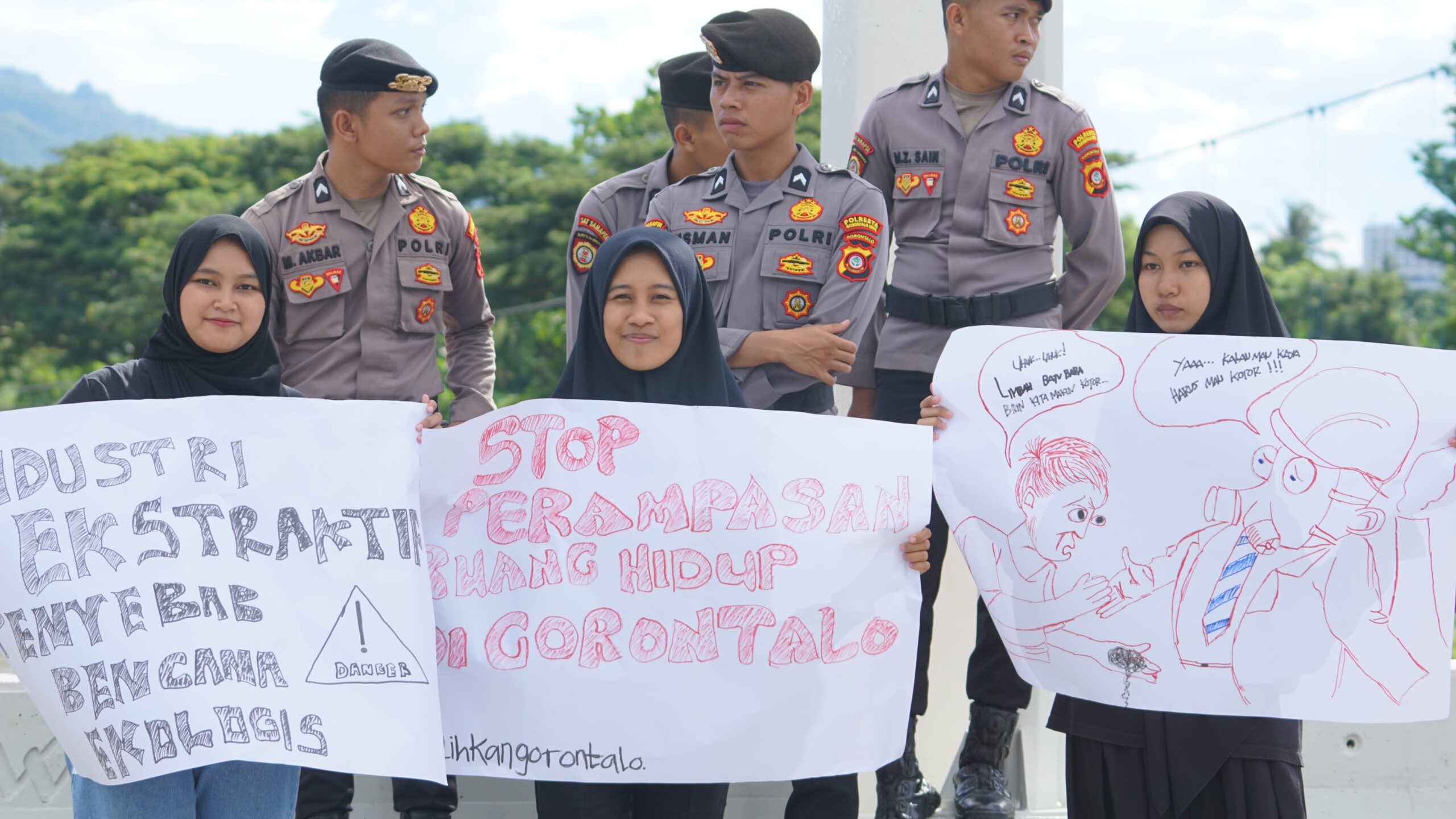 Puput Pakaya, Dinamisator Simpul WALHI Gorontalo lainnya, menjelaskan, aksi ini dilakukan untuk mengampanyekan bahaya industri ekstraktif yang mulai merambah hampir di setiap kabupaten di Provinsi Gorontalo.