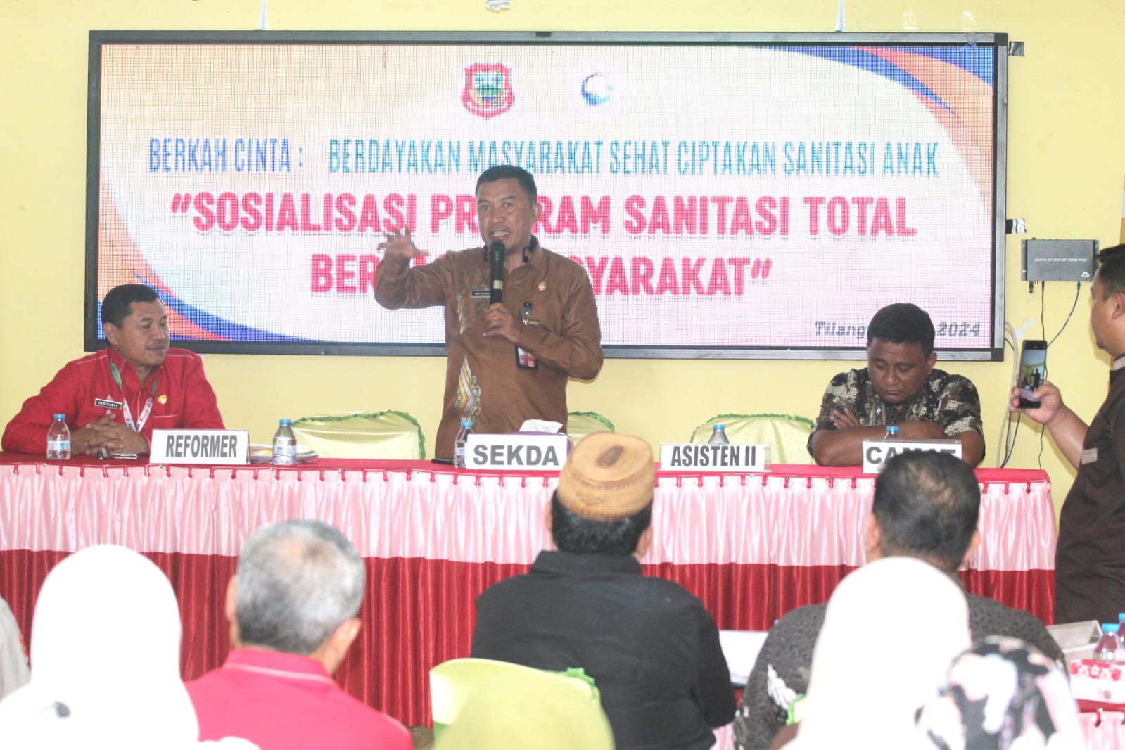 KOMPARASI.ID – Plh. Sekda Kabupaten Gorontalo, Haris Tome, membuka acara sosialisasi Program Sanitasi Total Berbasis Masyarakat di Aula Kantor Desa Tenggela, Kec. Tilango, Kab. Gorontalo, Kamis (25/7).