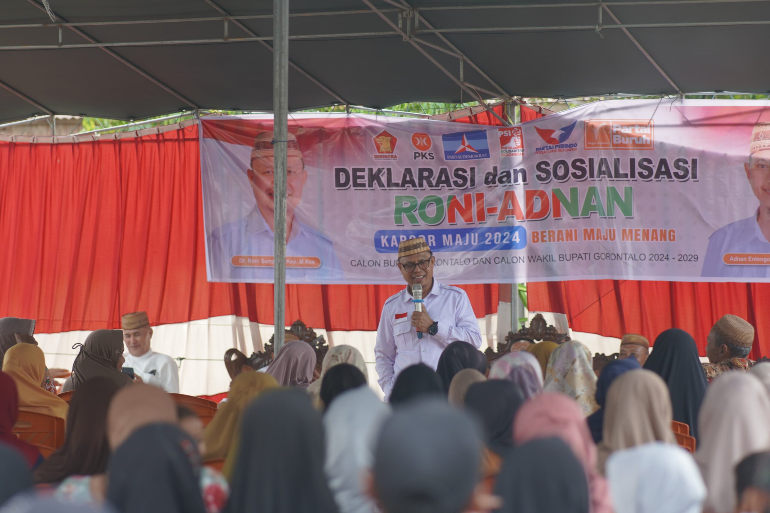 Dalam deklarasi pasangan calon Bupati dan Wakil Bupati Gorontalo, Roni Sampir dan Adnan Entengo (ROAD), yang digelar di Kecamatan Boliyohuto, Jumat (20/09/2024), Roni menyampaikan bahwa seluruh janji yang dibuatnya sudah mulai diwujudkan.