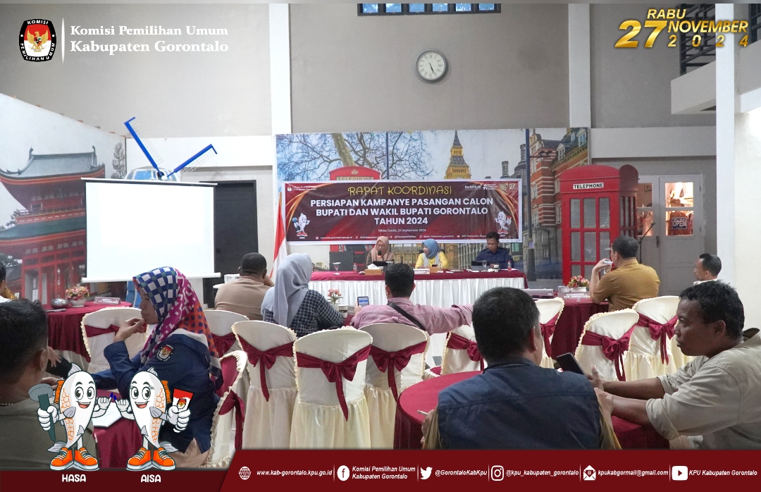 Plt Ketua KPU Kabupaten Gorontalo, Windarto M. Bahua, dalam arahannya menegaskan pentingnya semua pihak memahami mekanisme dan jadwal kampanye secara menyeluruh. “Pengundian nomor urut pasangan calon telah selesai, sekarang kita masuk tahap persiapan kampanye yang akan berlangsung dua bulan ke depan,” ujar Windarto di hadapan peserta rapat.