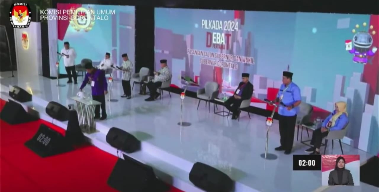 Moderator membacakan pertanyaan panelis yang menantang, apa langkah strategis yang akan diambil oleh para calon untuk menarik investasi dan menciptakan lapangan kerja baru di Gorontalo?