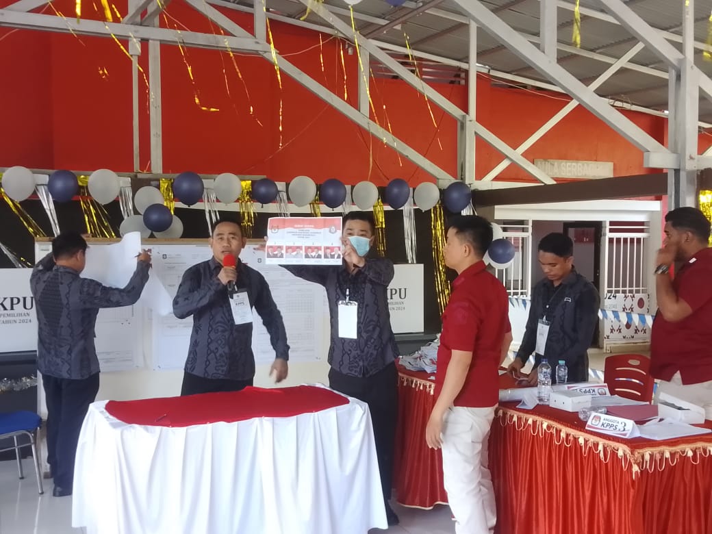 Salah satu anggota KPPS menyampaikan bahwa jumlah surat suara yang diterima dari Komisi Pemilihan Umum (KPU) sesuai dengan total Daftar Pemilih Tetap (DPT) di TPS tersebut, yaitu 571 orang.