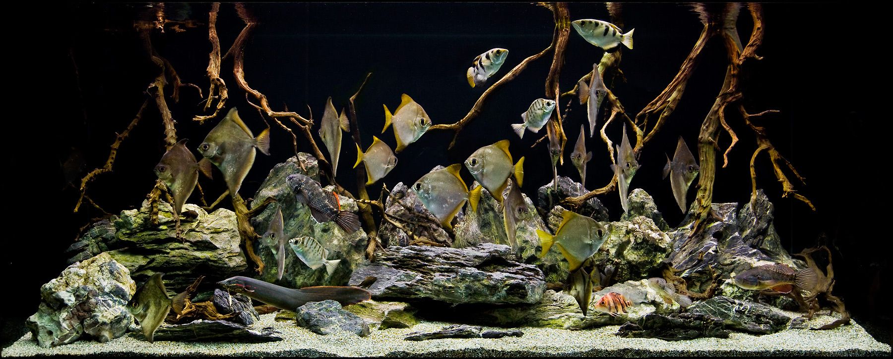 Ikan yang biasa menghuni akuarium hardscape antara lain cichlid dari Afrika serta angelfish dan discus dari Sungai Amazon. Air di dalam akuarium ini umumnya berwarna kekuningan kecokelatan seperti teh karena mengandung tanin.