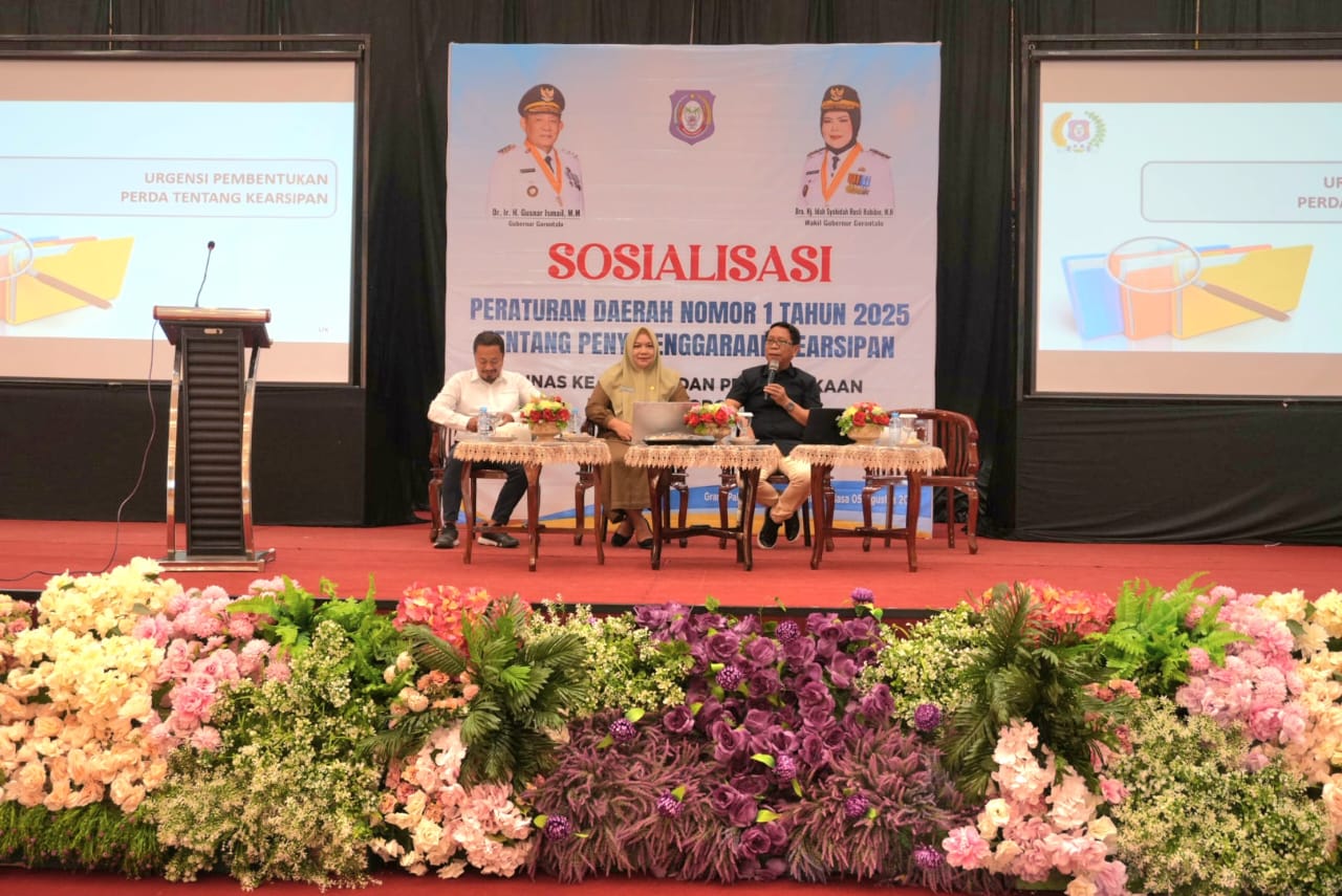 KOMPARASI.ID – Anggota DPRD Provinsi Gorontalo, Umar Karim, menyosialisasikan Peraturan Daerah (Perda) Nomor 1 Tahun 2025 tentang Penyelenggaraan Kearsipan dalam sebuah kegiatan di Grand Palace Convention Center, Selasa (5/8/2025).