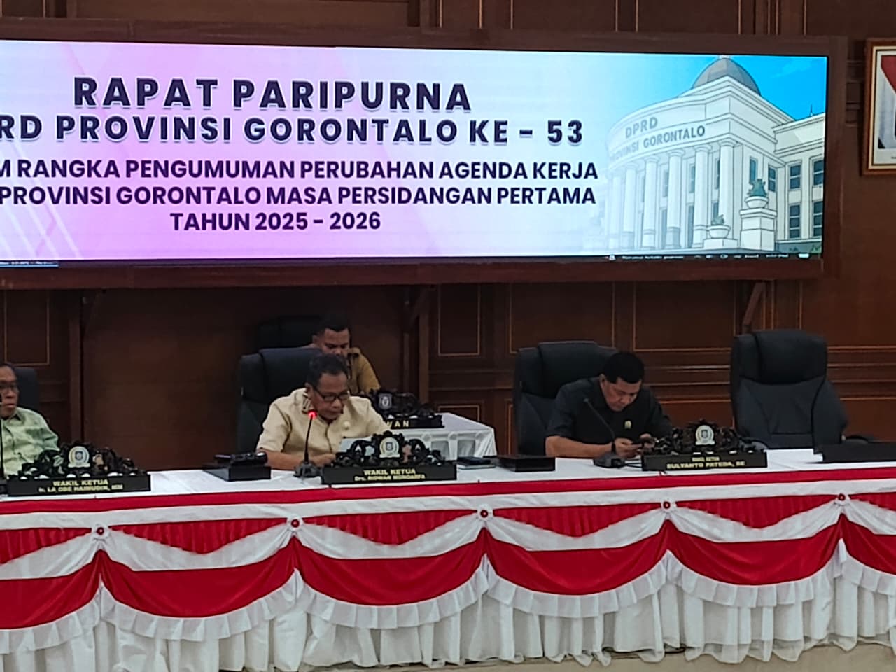 KOMPARASI.ID – Dewan Perwakilan Rakyat Daerah (DPRD) Provinsi Gorontalo resmi mengesahkan perubahan jadwal kerja legislatif tahun 2025–2026 melalui rapat paripurna yang digelar di ruang rapat utama, Senin (13/10/2025).